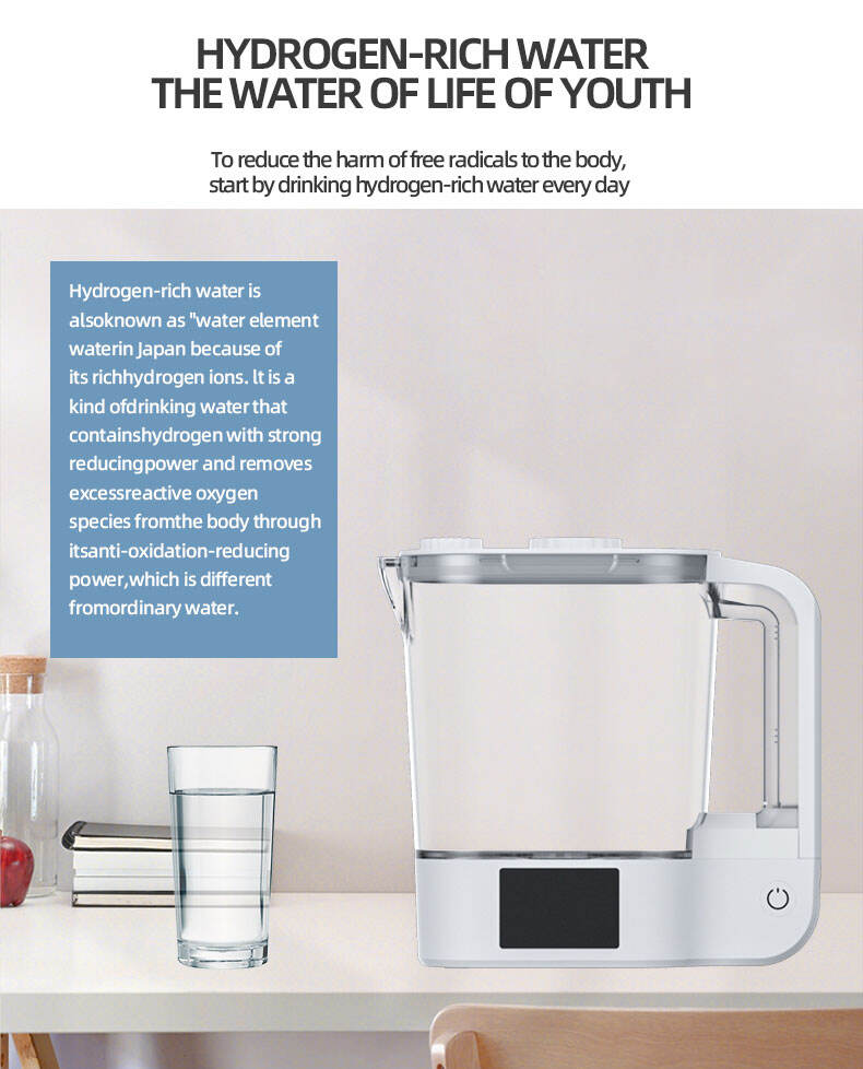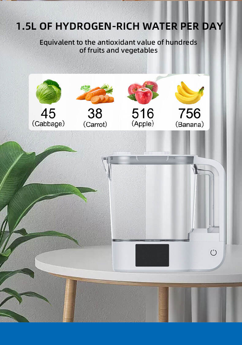 Nikmati dua manfaat dalam satu peranti — ketel moden yang bergaya dan peranti kesejahteraan hidrogen peribadi. Dengan kapasiti kaca bebas BPA sebanyak 1.5L dan operasi satu tekan yang intuitif, mencapai penghidratan pada tahap sel setiap hari tidak pernah semudah atau se-elegan ini.